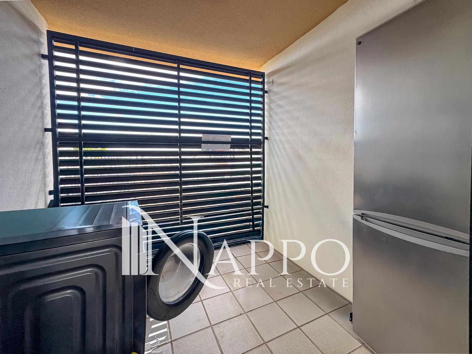 The property comprises a spacious and bright living room with a covered terrace, a fully equipped kitchen with access to a practical laundry terrace, two double bedrooms: the master bedroom with en-suite bathroom and whirlpool bath, and a second double bedroom with mountain views. The layout is completed by a second bathroom with shower. The living room and suite enjoy sea views, while the kitchen and second bedroom face the mountains, providing natural light and cross ventilation.