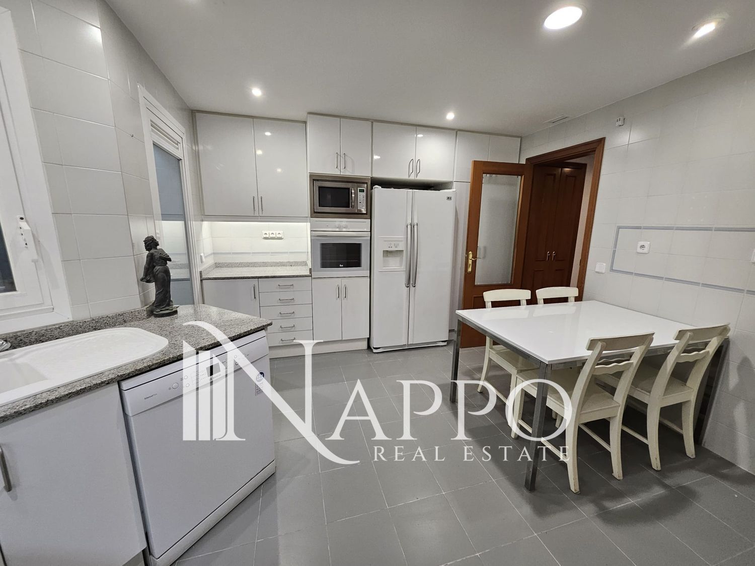 The property offers 185 sqm distributed into a generous living-dining room with access to a terrace and balcony, a fully equipped independent kitchen with all appliances and laundry area, four bedrooms (one currently used as an office), and three full bathrooms. It also features two separate entrances, including a service entrance.