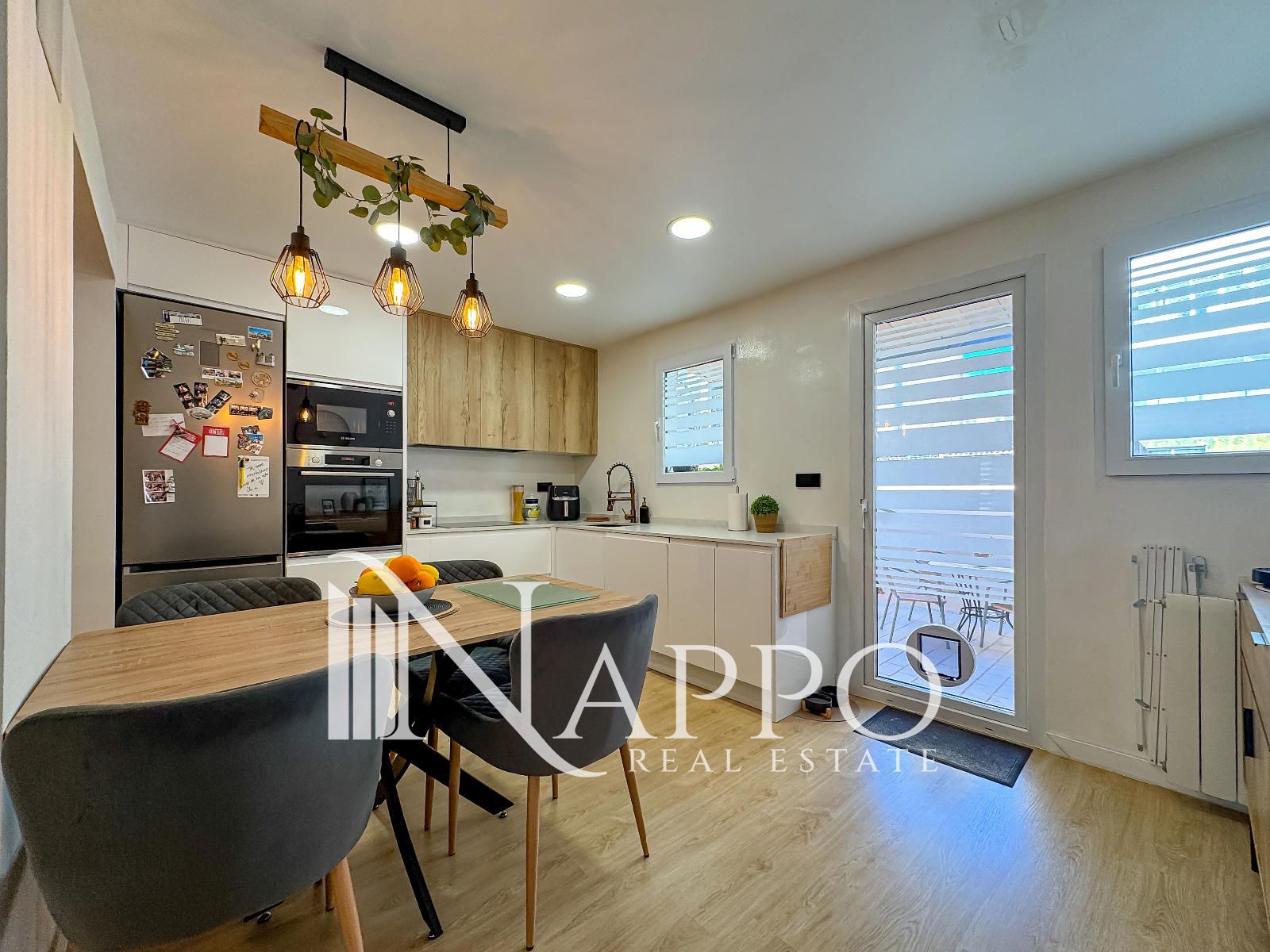From the kitchen there is direct access to a private patio terrace, a perfect space for summer afternoons, outdoor dining or relaxing moments.