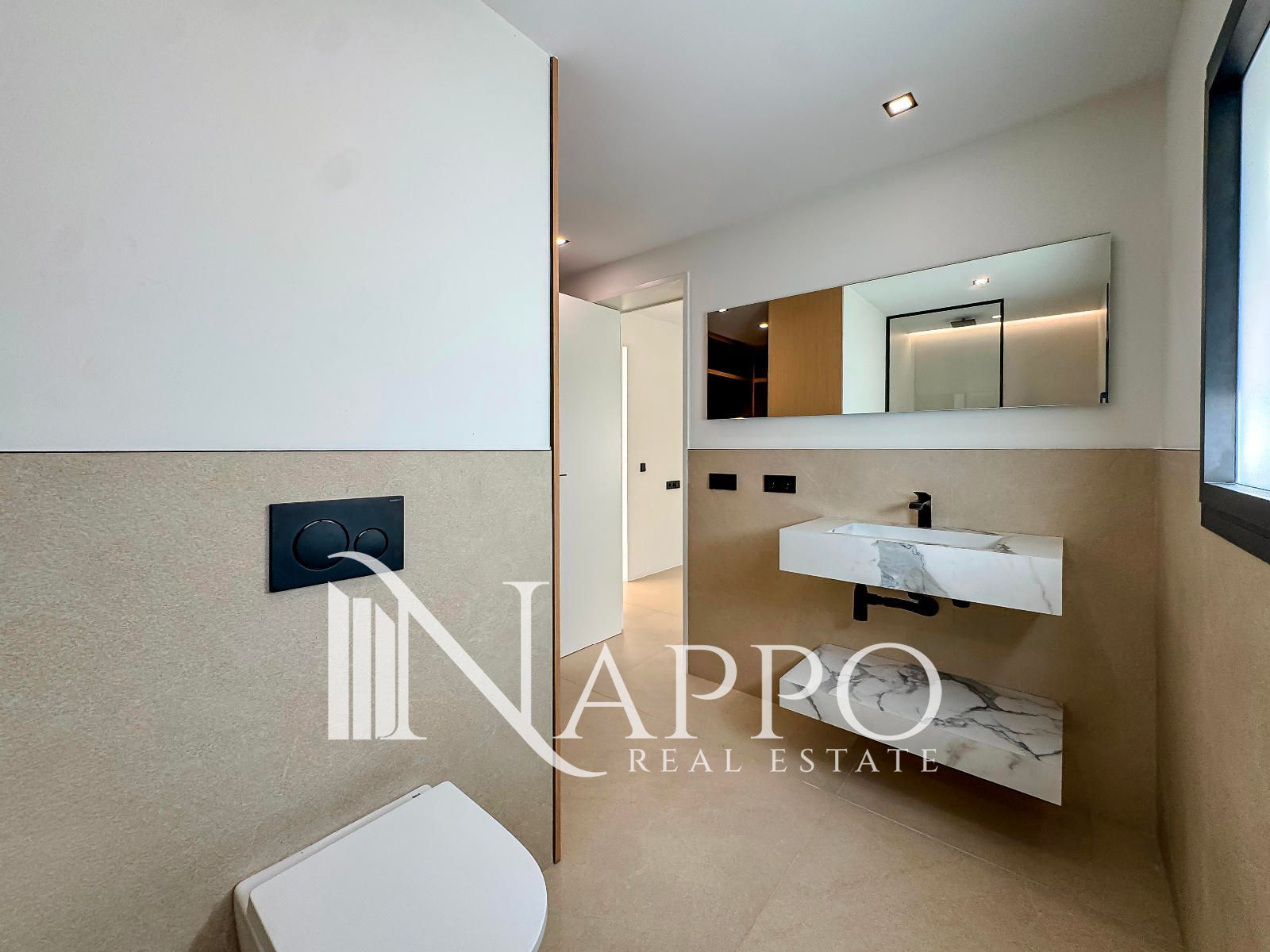 Built in 2025, the property is distributed over two floors and offers 237 sqm of built area on a 620 sqm plot. It features three bedrooms and three bathrooms, two of them en suite. The spacious master bedroom is located on the first floor with direct access to a large sun terrace. The bright living room, with floor-to-ceiling windows, opens onto the terrace and the private outdoor area with swimming pool and garden. The open-plan kitchen allows flexible layout options.