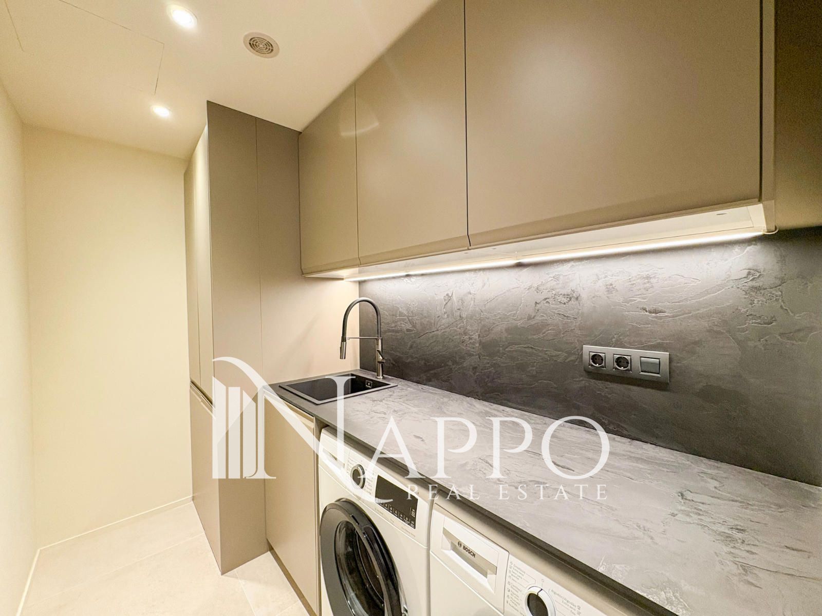 The apartment stands out for its premium qualities, including Porcelanosa materials, Mitsubishi heat pump system, air conditioning, water-based underfloor heating by Schluter and German-standard windows ensuring excellent thermal and acoustic insulation.