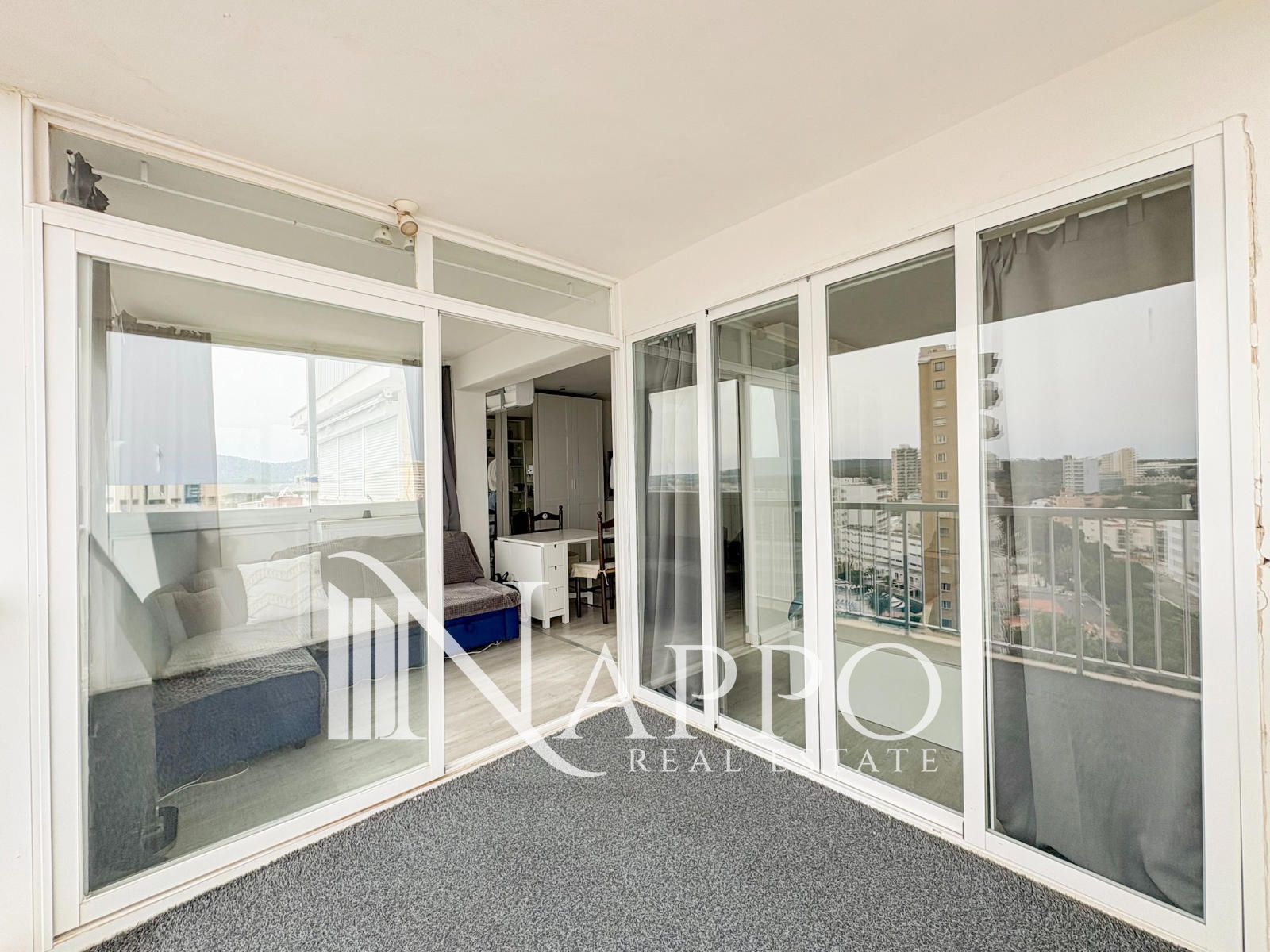 Nappo Real Estate is pleased to present this spectacular apartment on the 12th floor in Magaluf, where natural light, privacy, and stunning sea views take center stage. Located in an area with easy access to supermarkets, restaurants, public transport, and essential services, it offers excellent connectivity and a high quality of life. Its height ensures peace, natural ventilation, and an open panoramic outlook.