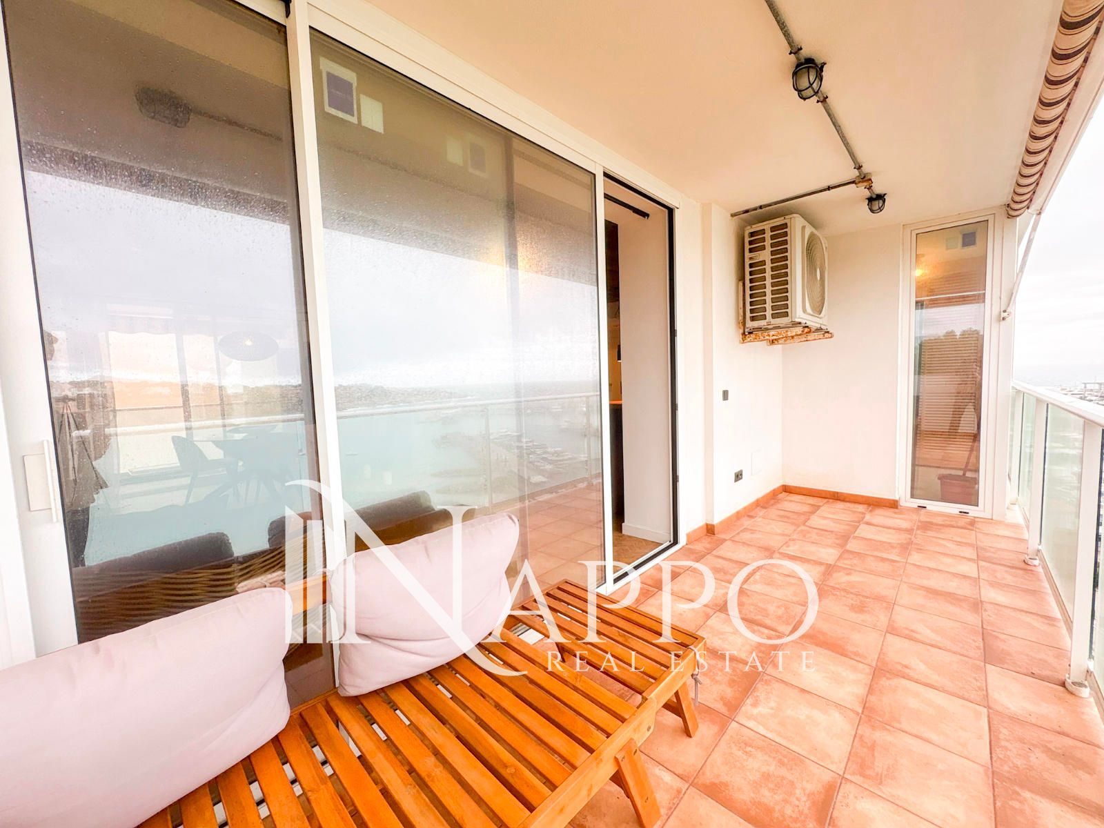 Located in a building with a lift within an exclusive residential complex on the seafront, the flat is on a convenient floor and has hot/cold air conditioning, double-glazed aluminium windows, parquet flooring, a fully equipped open-plan kitchen with an adjacent utility room, a spacious living-dining room with access to two terraces, one of approximately 10 m² with stunning open views of the sea and the harbour, and another of 6 m² with pleasant views of the communal gardens, two bedrooms, one of which is a double with a completely renovated en-suite bathroom and dressing room, a second bedroom with access to a terrace and a second full bathroom, also including a 20 m² garage space in the price.