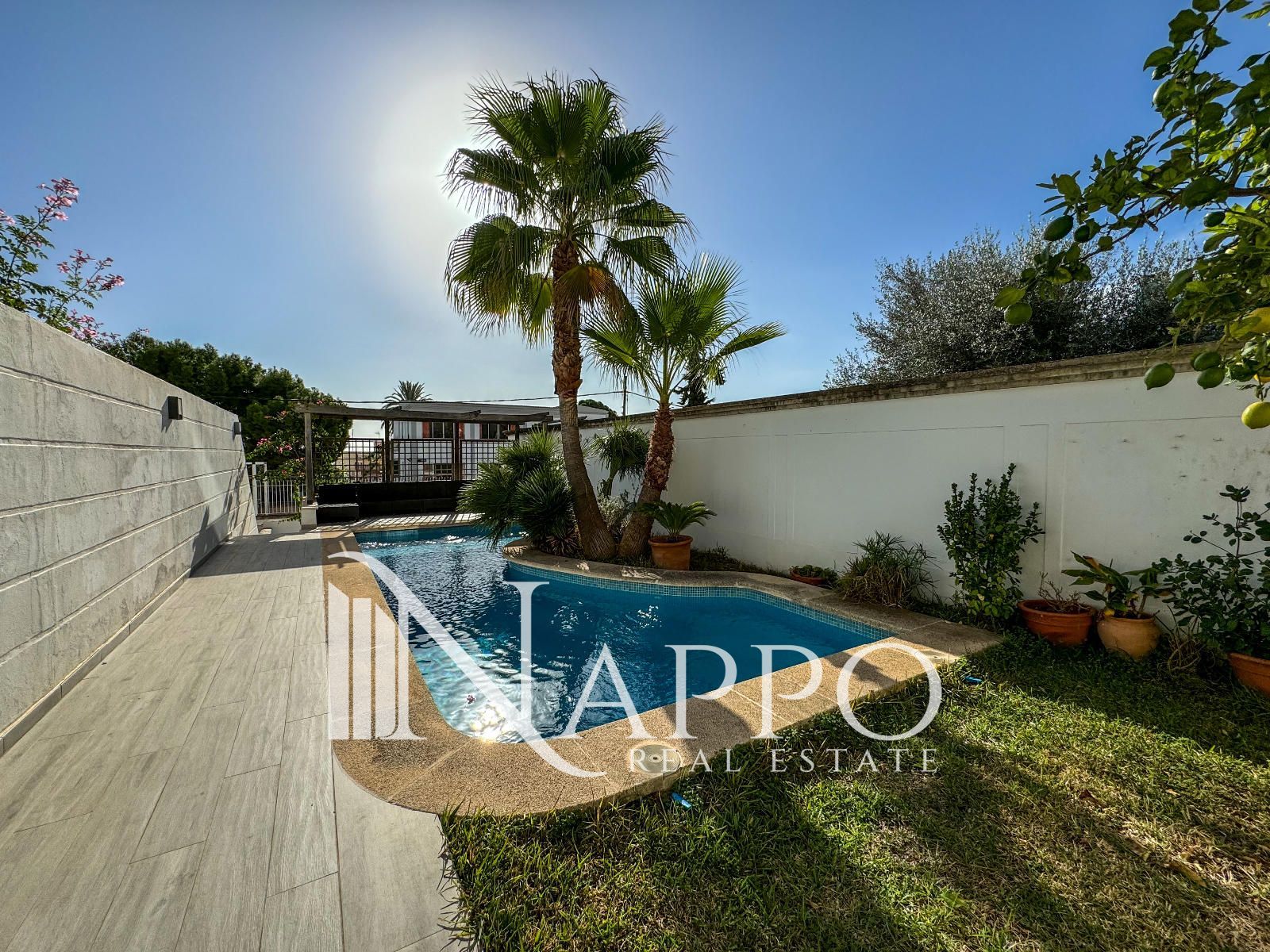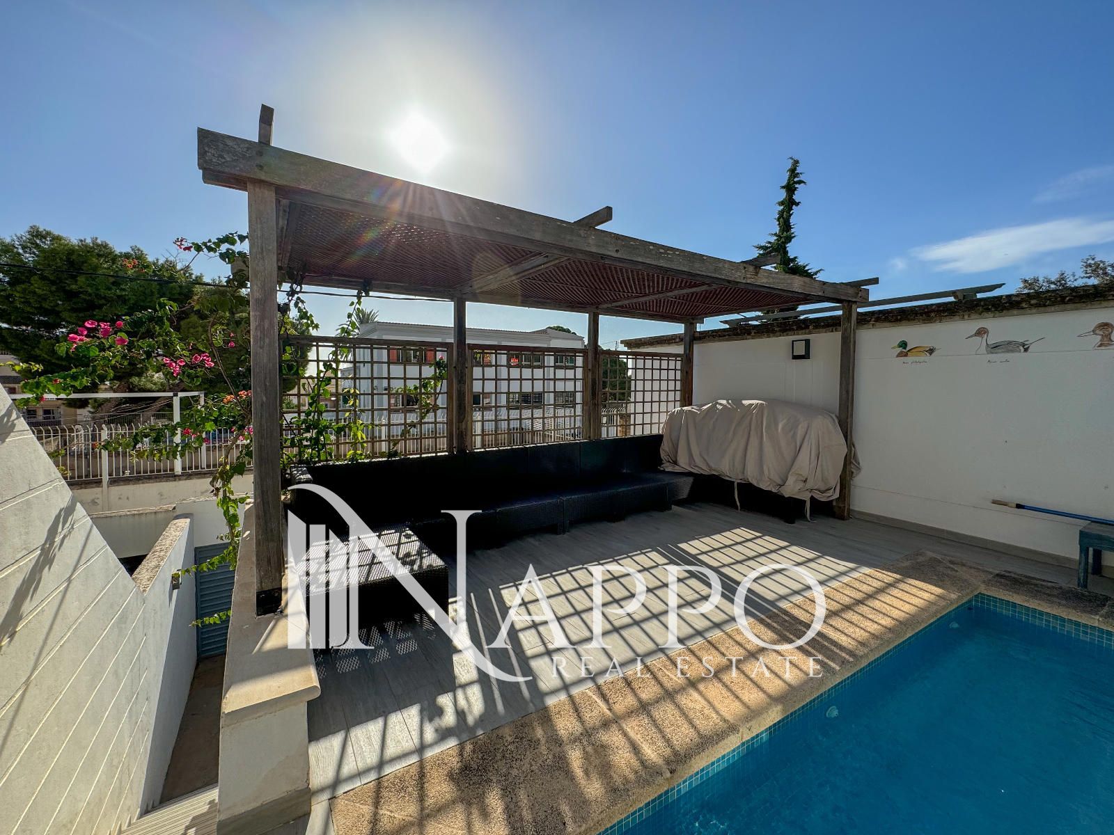 En el exterior, la parcela de 270 m² dispone de un jardín bien cuidado y una piscina privada, creando un entorno perfecto para el relax y el entretenimiento al aire libre. La casa también cuenta con una zona de barbacoa en una de las terrazas, ideal para organizar comidas al aire libre.