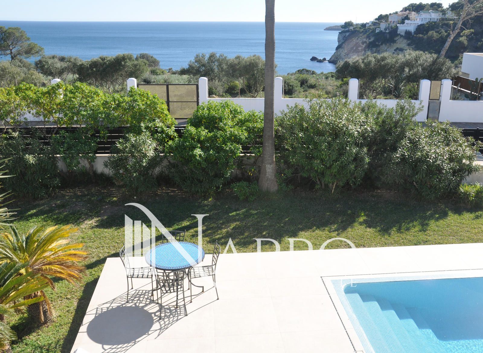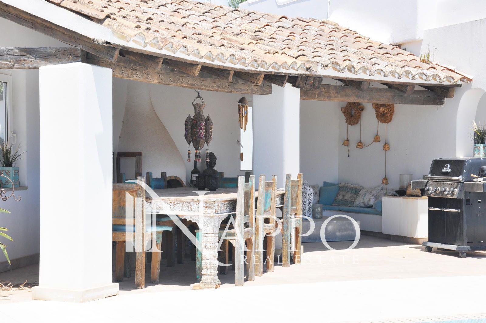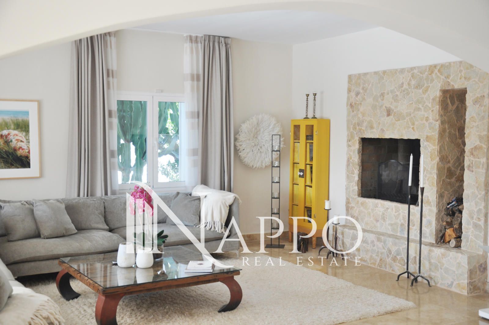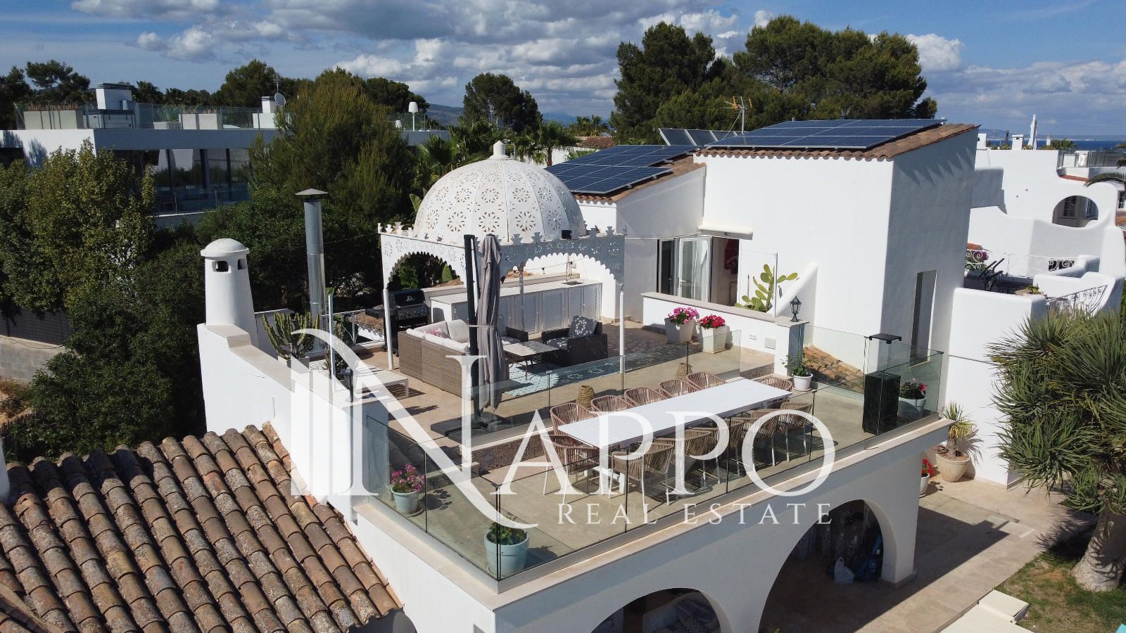 Nappo Real Estate tiene el placer de presentaros esta espectacular villa de lujo de estilo ibicenco con vistas al mar y piscina privada, situada en la exclusiva zona de Sol de Mallorca, distribuida en dos plantas y ubicada en una amplia parcela de 1.470 m². La zona destaca por su tranquilidad, privacidad y cercanía a calas de aguas cristalinas, además de contar con buenas conexiones, acceso a servicios, campos de golf, zonas de ocio y a pocos minutos de Puerto Portals y del centro de Palma.