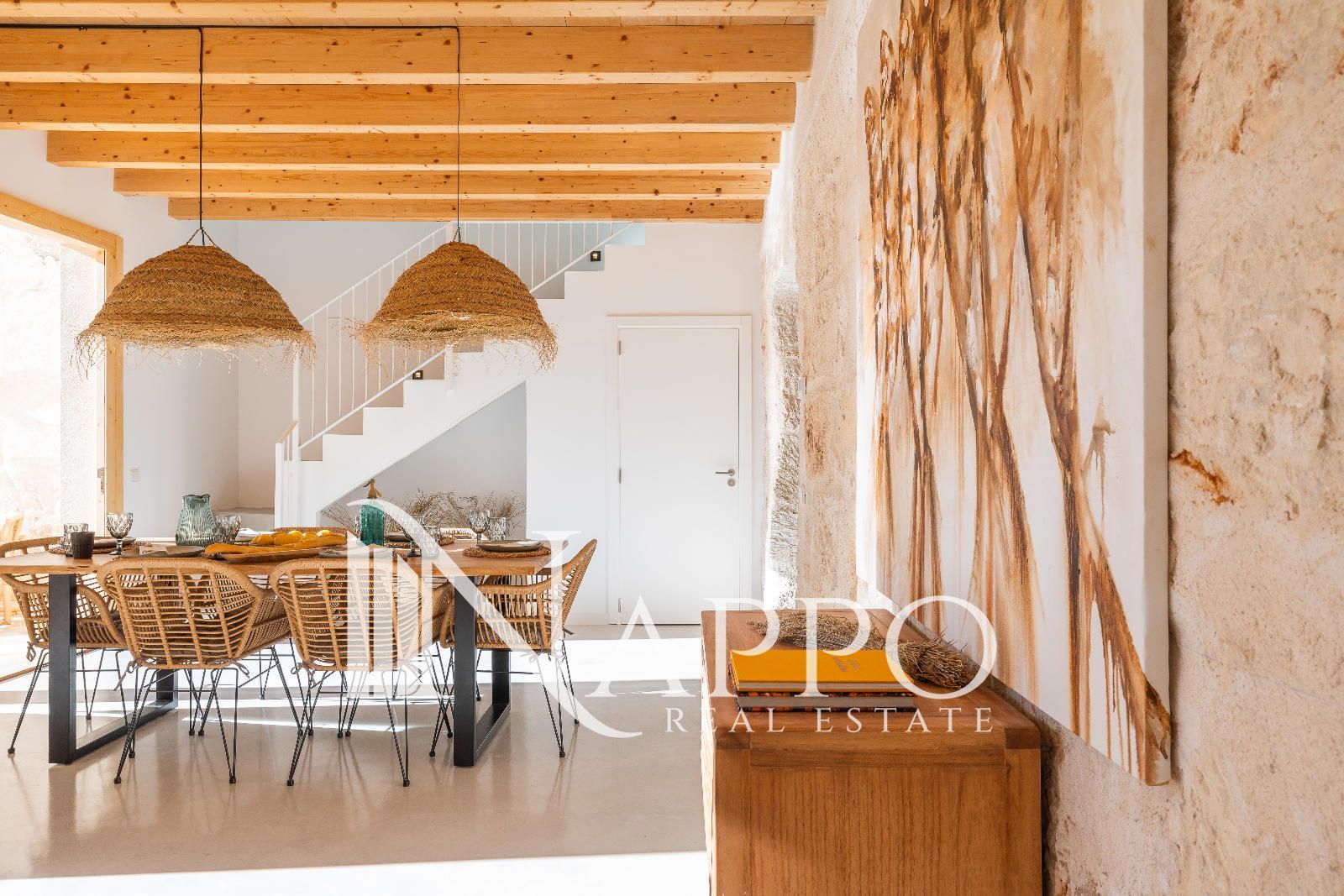 El diseño interior combina materiales tradicionales como piedra marés con acabados contemporáneos como suelos de cemento pulido, logrando un equilibrio perfecto entre autenticidad y modernidad. Además, cuenta con sistema de calefacción central mediante bomba de calor, conexión a red municipal, cisterna privada y preinstalación para paneles solares y chimenea, aportando eficiencia y confort.