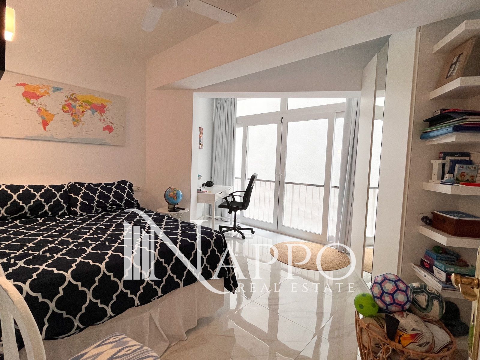 La propiedad se divide exactamente en dos partes con una zona totalmente open space con cocina americana con una mesa alta en el centro, salon comedor y acceso a un fabuloso balcón con vistas parciales al mar y en la otra parte tres habitaciones dobles y dos baños completos con plato ducha. El dormitorio principal dispone de baño en suite y un practico vestidor. La otra habitacion doble dispone de una elegante zona chill out.