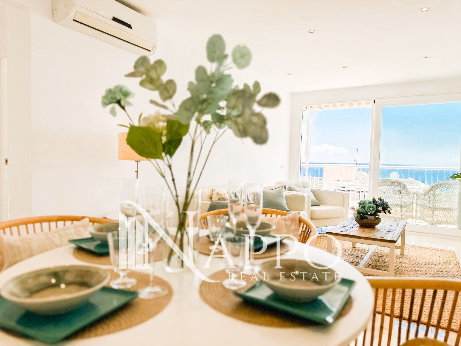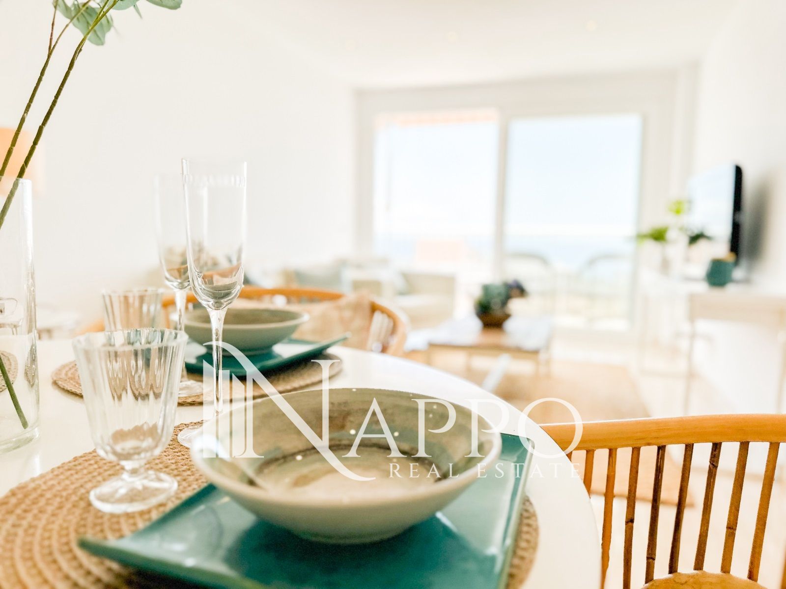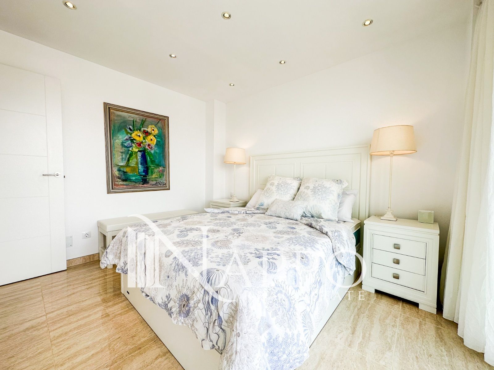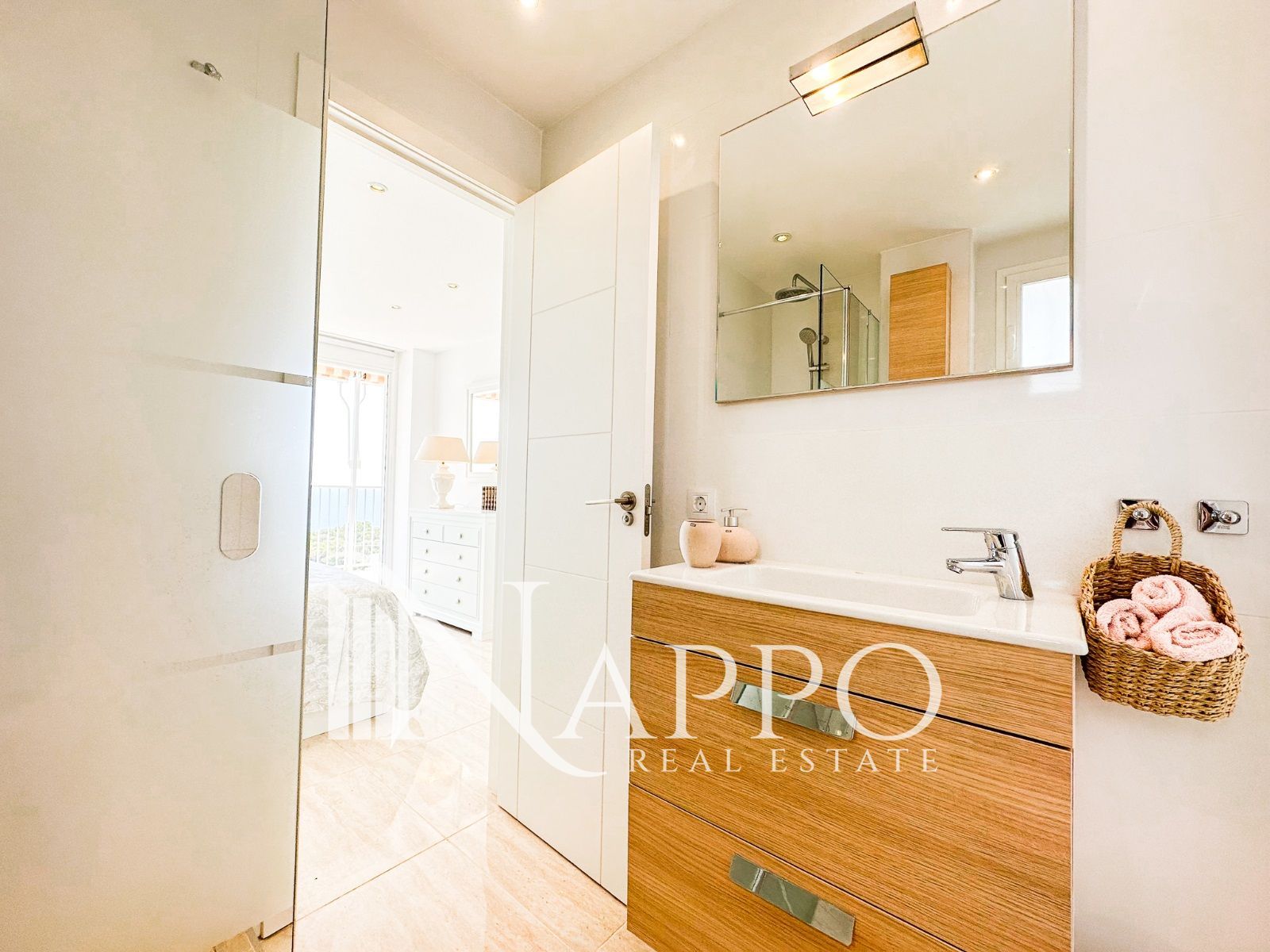 El apartamento nos brinda la bienvenida al entrar gracias a un acogedor recibidor que por un lado nos proporciona un practico aseo de invitados y por el otro lado nos deja acceso a un pasillo donde encontramos a mano derecha una cocina independiente totalmente equipada con todos los electrodomesticos necesarios, una amplia y luminosa zona social con comedor y salón, dos dormitorios dobles (uno de ellos con vistas directas al mar) de un tamaño muy parecido que conectan ambos a un elegante baño en suite central con plato ducha. Tanto la zona social como las dos habitaciones, llevan a un increible balcón con vistas increibles al mar y despejadas. El balcón que rodea en "L" toda la propiedad pone a disposición una zona de lavandaria cerrada.