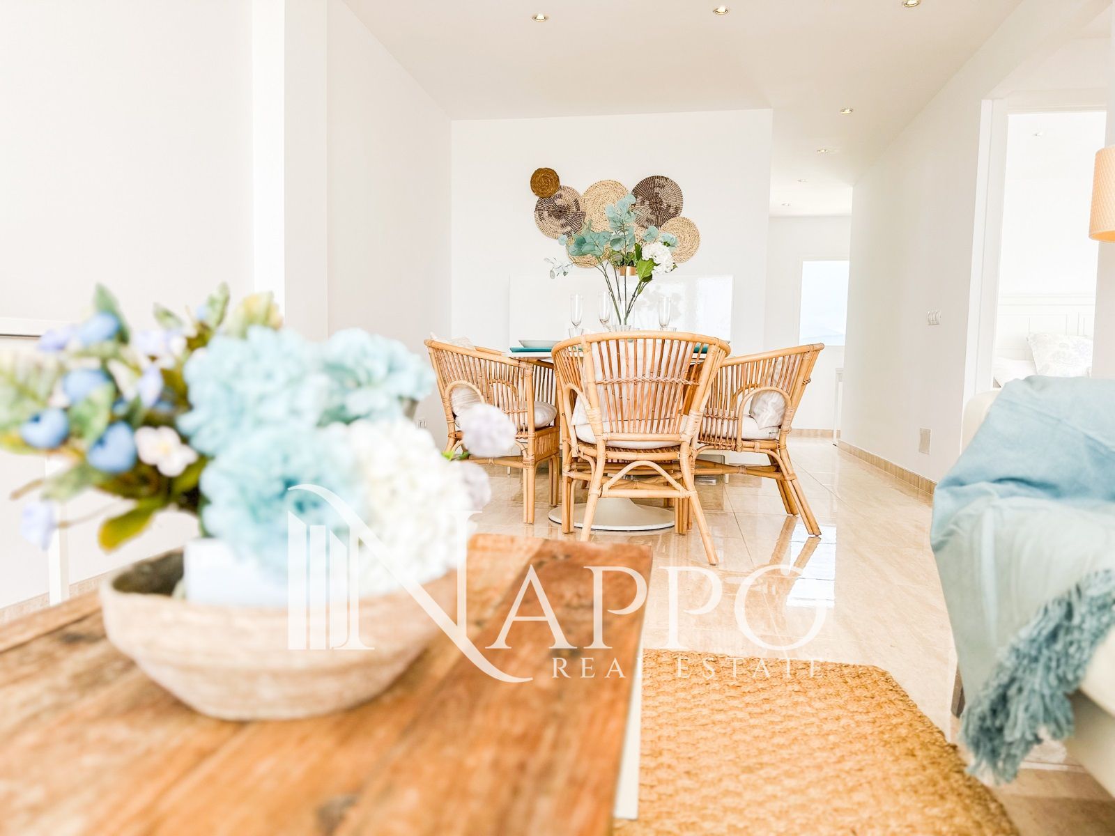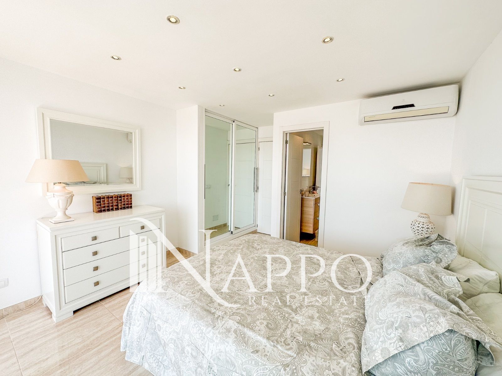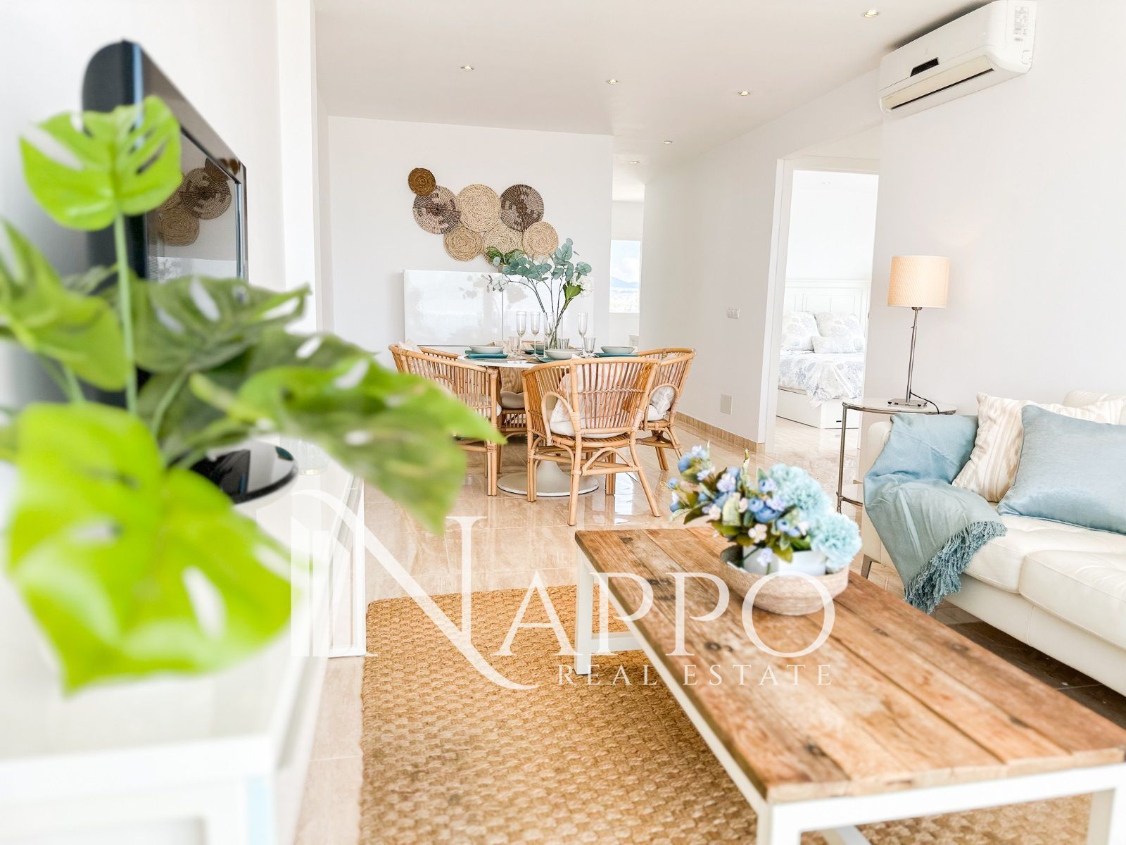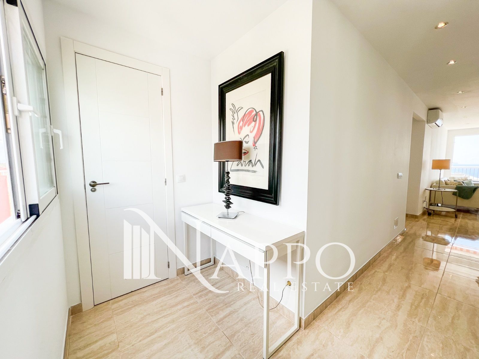 El apartamento nos brinda la bienvenida al entrar gracias a un acogedor recibidor que por un lado nos proporciona un practico aseo de invitados y por el otro lado nos deja acceso a un pasillo donde encontramos a mano derecha una cocina independiente totalmente equipada con todos los electrodomesticos necesarios, una amplia y luminosa zona social con comedor y salón, dos dormitorios dobles (uno de ellos con vistas directas al mar) de un tamaño muy parecido que conectan ambos a un elegante baño en suite central con plato ducha. Tanto la zona social como las dos habitaciones, llevan a un increible balcón con vistas increibles al mar y despejadas. El balcón que rodea en "L" toda la propiedad pone a disposición una zona de lavandaria cerrada.