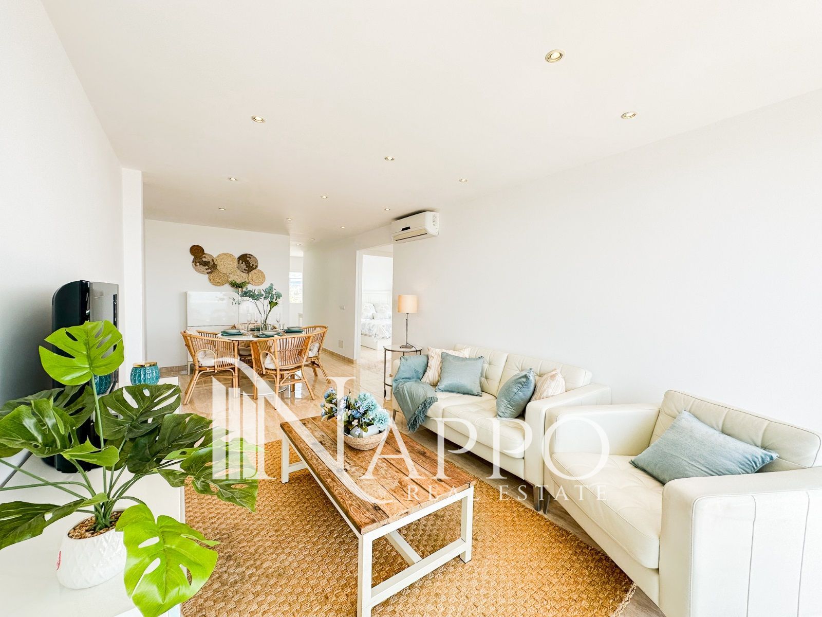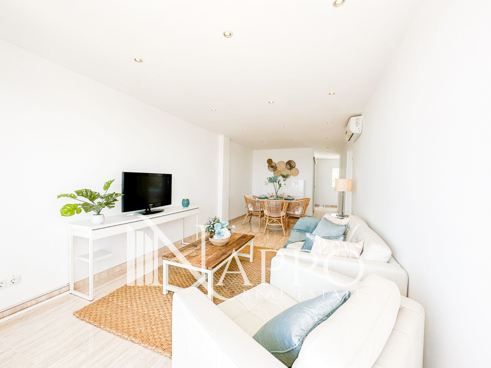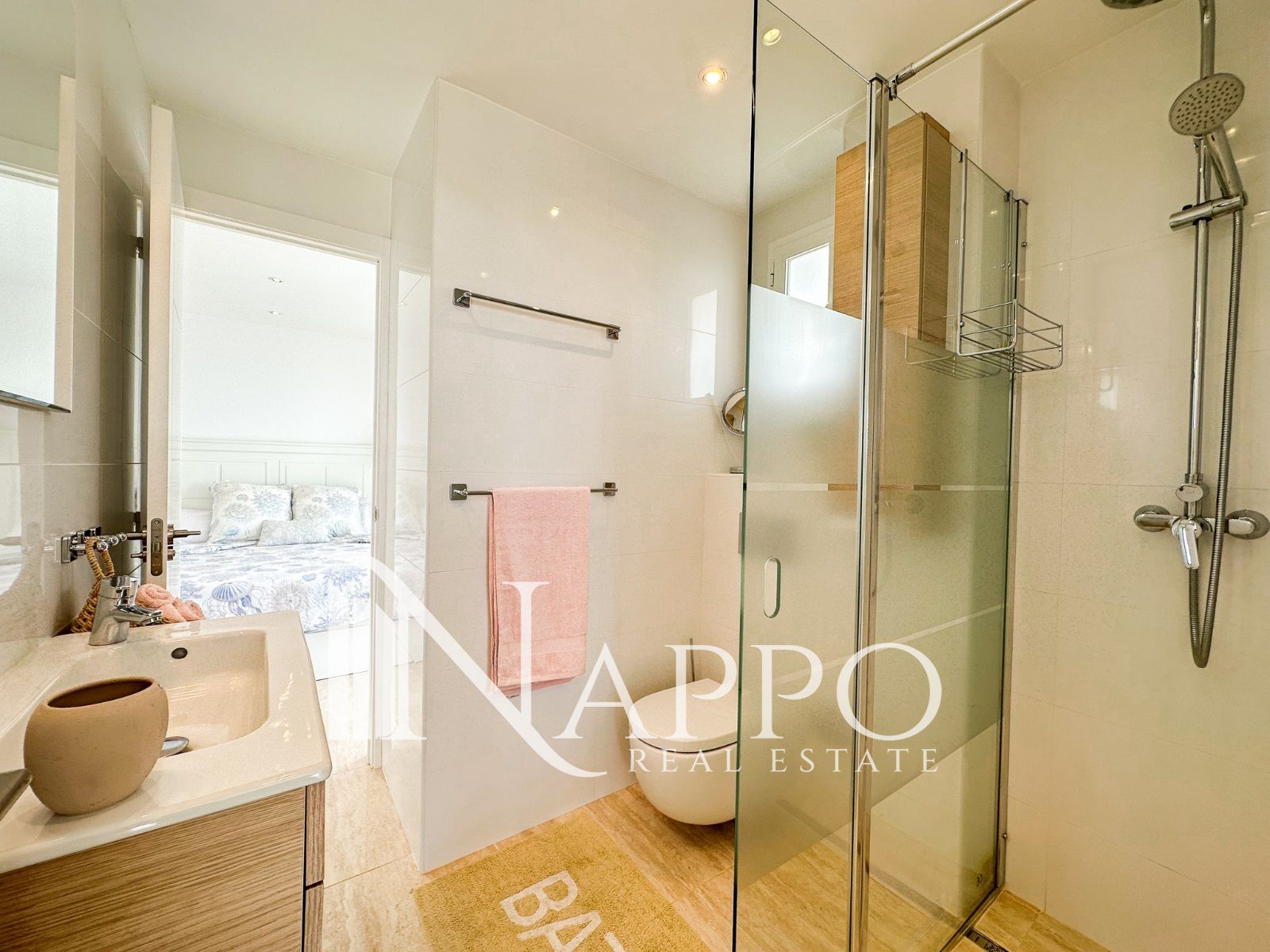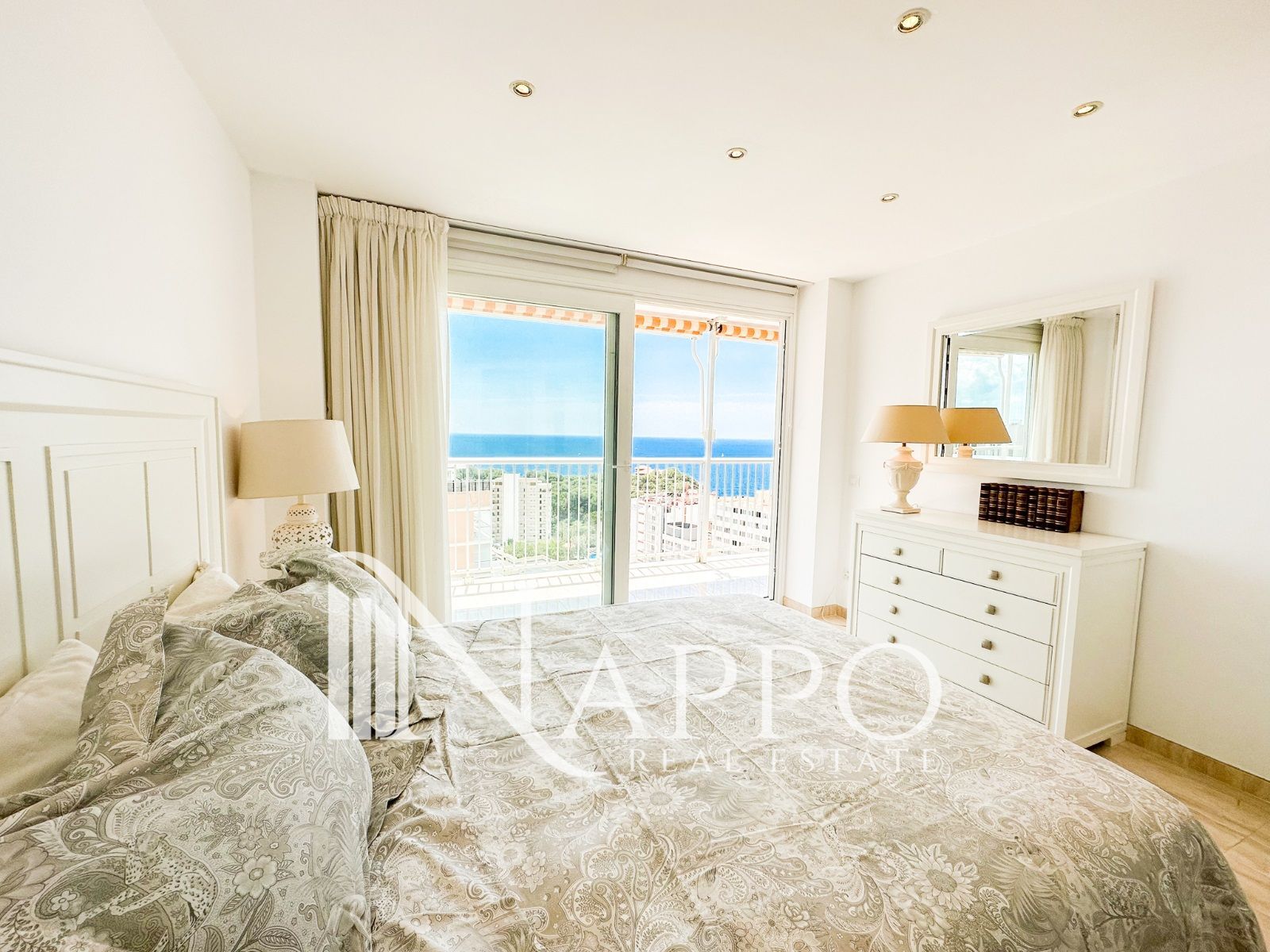El apartamento nos brinda la bienvenida al entrar gracias a un acogedor recibidor que por un lado nos proporciona un practico aseo de invitados y por el otro lado nos deja acceso a un pasillo donde encontramos a mano derecha una cocina independiente totalmente equipada con todos los electrodomesticos necesarios, una amplia y luminosa zona social con comedor y salón, dos dormitorios dobles (uno de ellos con vistas directas al mar) de un tamaño muy parecido que conectan ambos a un elegante baño en suite central con plato ducha. Tanto la zona social como las dos habitaciones, llevan a un increible balcón con vistas increibles al mar y despejadas. El balcón que rodea en "L" toda la propiedad pone a disposición una zona de lavandaria cerrada.