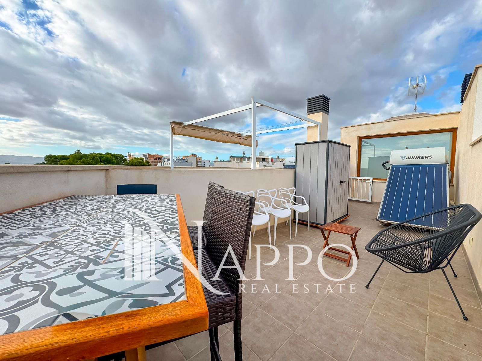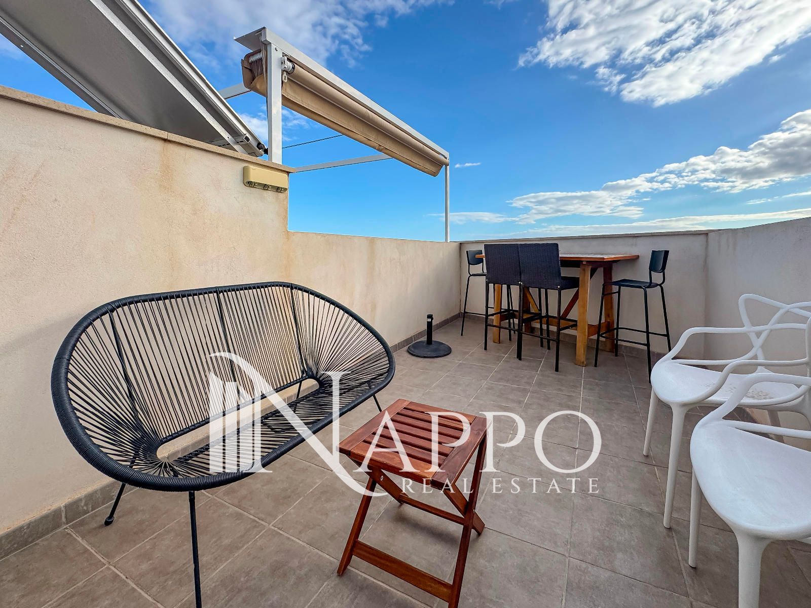 Cuenta con dos habitaciones dobles, dos baños completos (ambos con plato de ducha y uno de ellos en suite), una cocina totalmente equipada y con altas calidades, un salón-comedor amplio con luz natural abundante y salida al balcón, zona de coladuría independiente y además una terraza privada en la azotea donde podrás disfrutar de espectaculares vistas al mar.