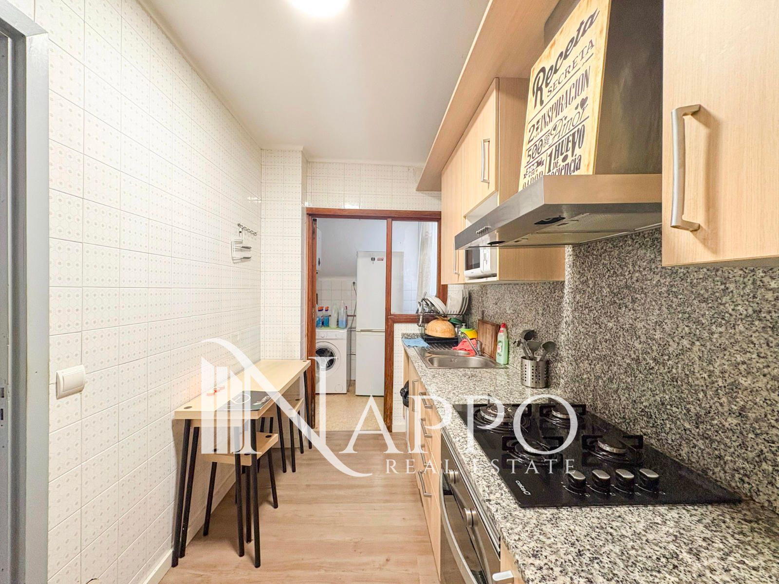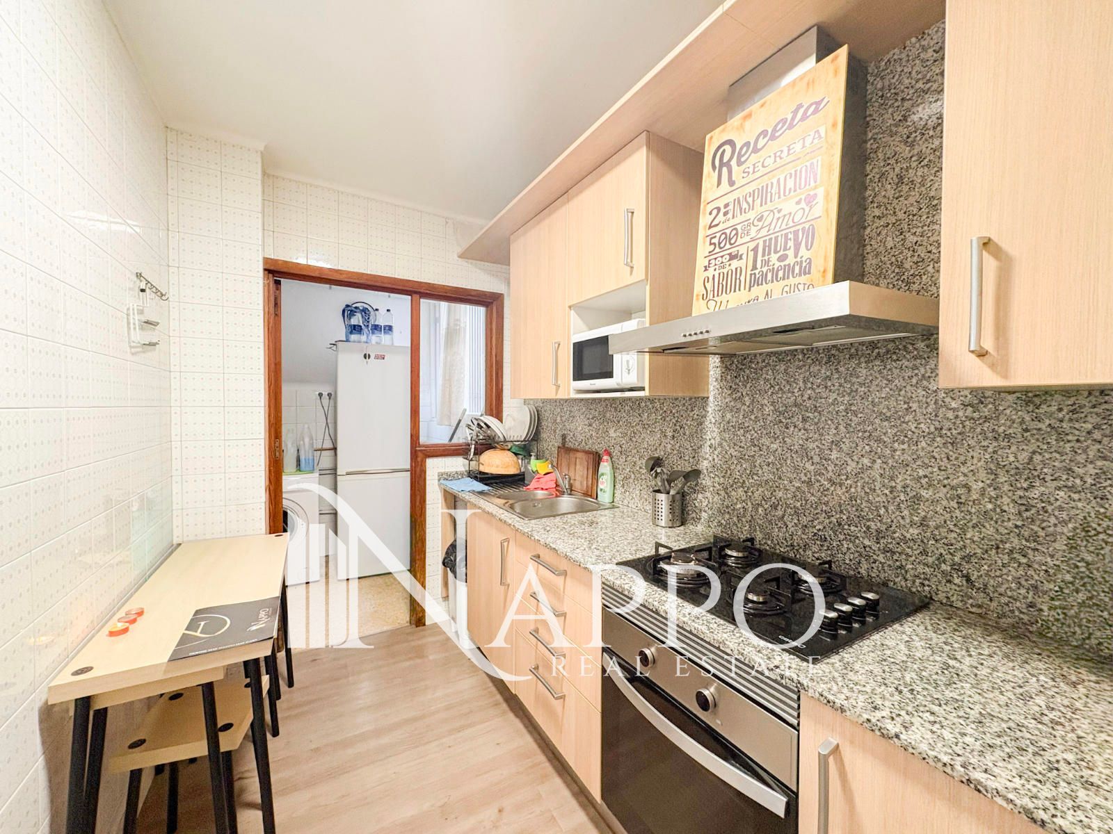 La zona de día se organiza en un salón–comedor amplio y luminoso, con un gran ventanal que inunda el espacio de luz natural y ofrece zona de comedor perfectamente integrada. La cocina independiente, práctica y bien distribuida, cuenta con encimera de gas, horno y abundante espacio de almacenaje. Además, dispone de una zona anexa ideal como coladuría o galería, aportando funcionalidad al conjunto.
