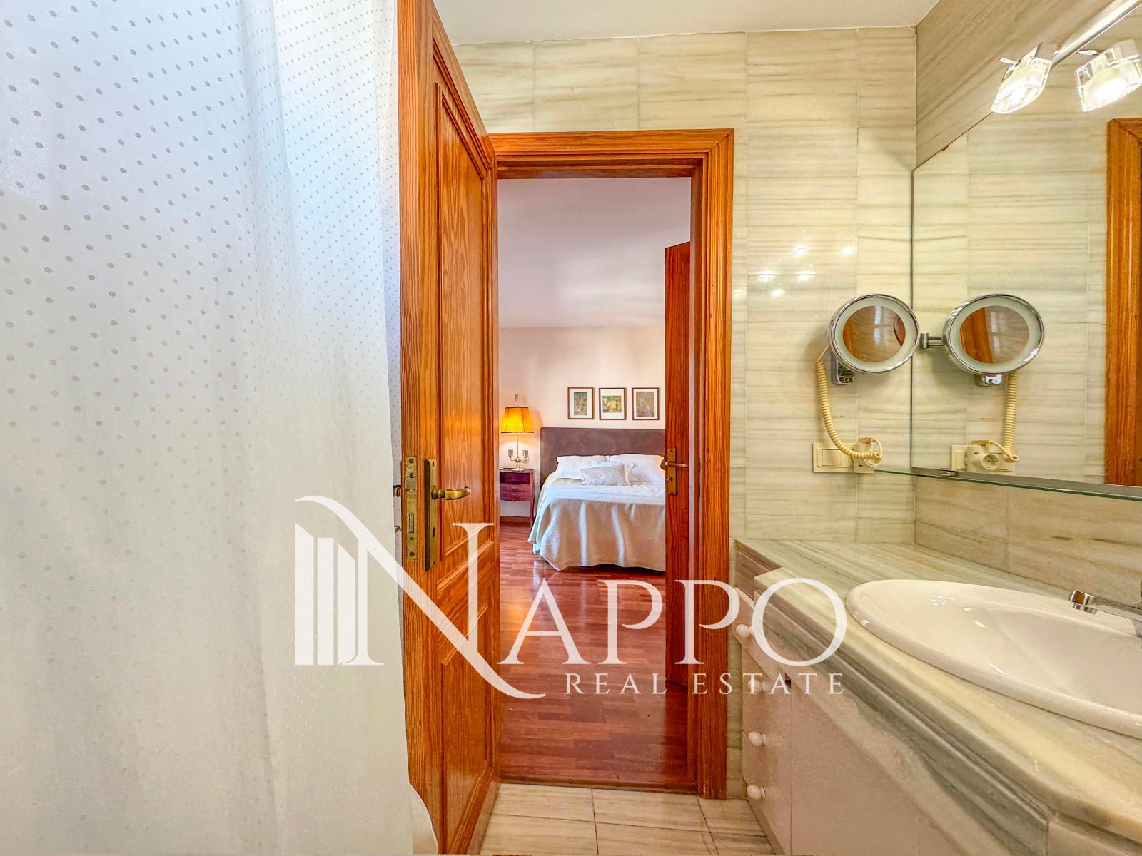 En la planta baja se encuentra un amplio salón-comedor de doble altura con chimenea y salida a una luminosa y familiar terraza de 60m². Una cocina independiente y totalmente equipada con electrodomésticos de alta calidad. También tiene una habitación doble y un baño de cortesía con plato de ducha. La primera planta cuenta con 3 dormitorios dobles exteriores (todos con armarios empotrados y salida a sus respectivos balcones) y un baño completo con bañera. En la segunda planta se ubica la habitación principal con balcón y baño en-suite con bañera. Además, tiene dos armarios empotrados y una zona de lavandería con balcón.