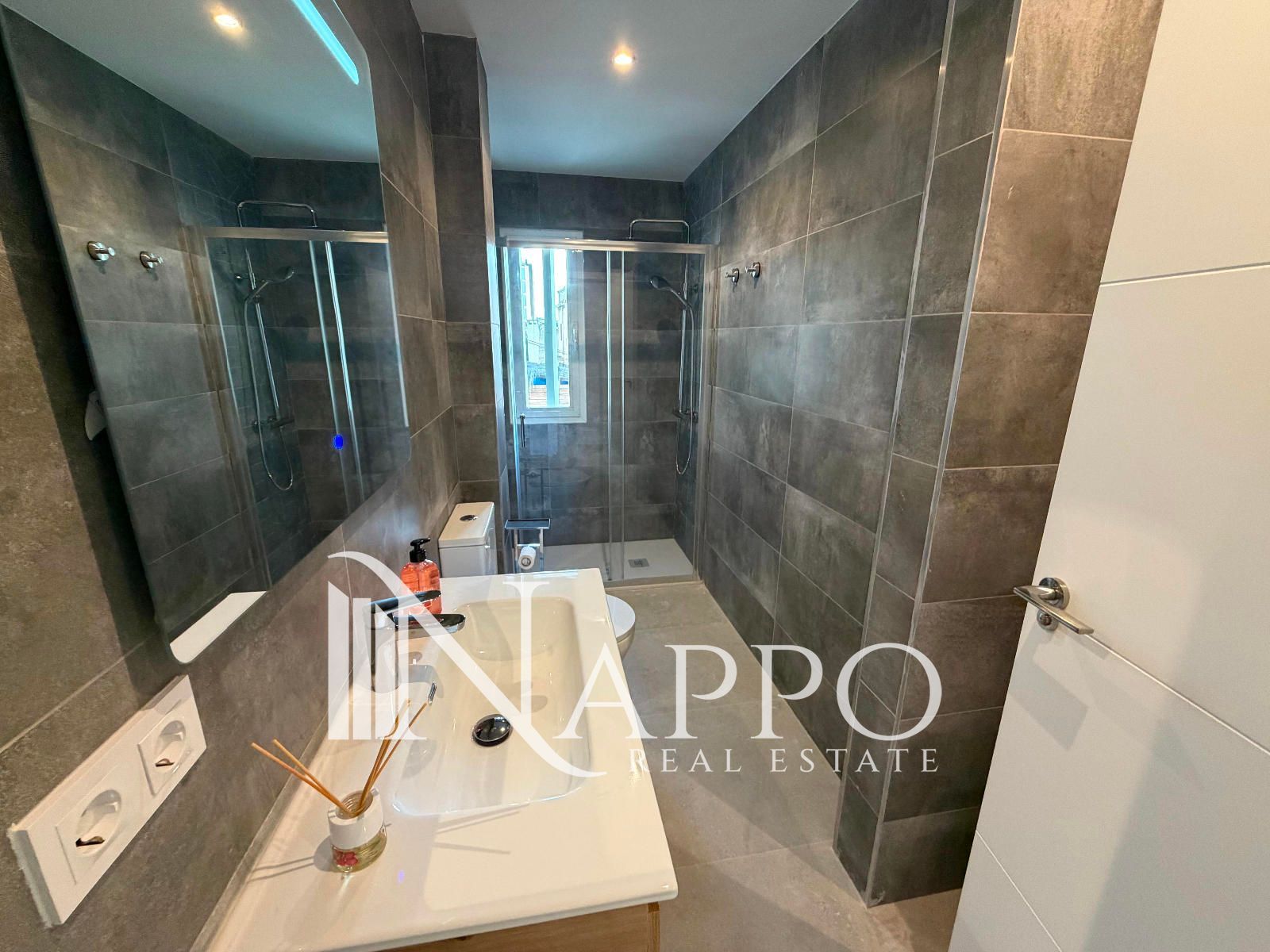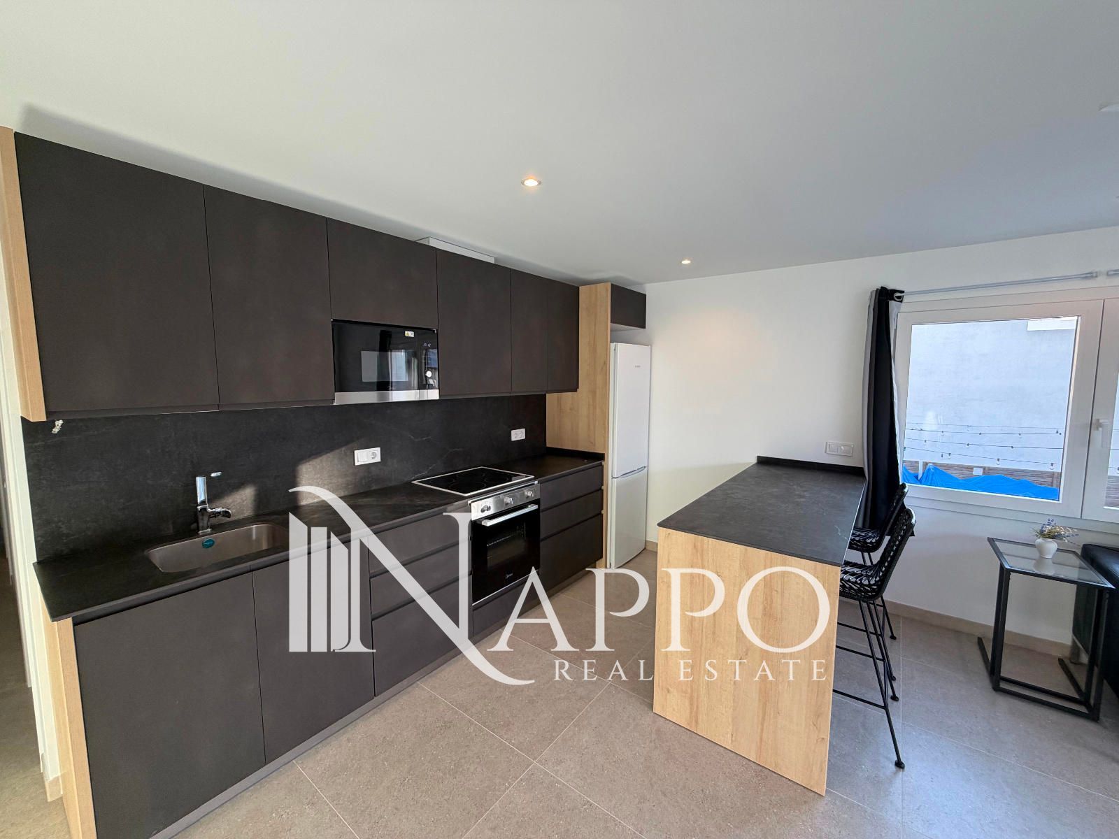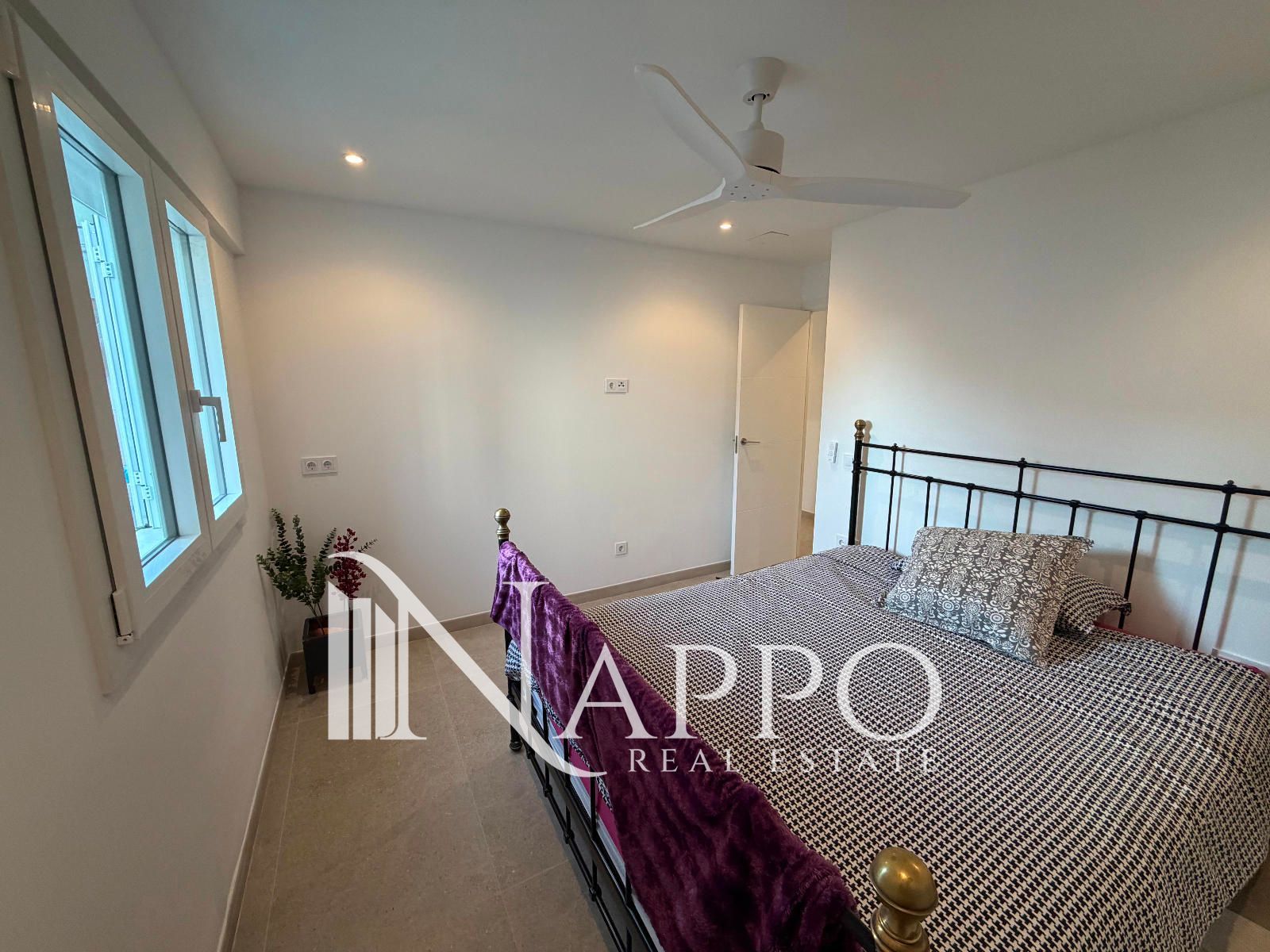 La vivienda cuenta con dos habitaciones dobles, una de ellas más amplia, ambas equipadas con ventilador de techo, lo que garantiza confort durante todo el año. Dispone además de un baño completo con plato de ducha y una cocina abierta conectada al amplio y luminoso salón-comedor también equipado con ventilador de techo, desde el que se accede directamente a la terraza, perfecta para disfrutar del ambiente de la plaza y de la luz natural, así como de sus inmejorables vistas al Castillo de Bellver.